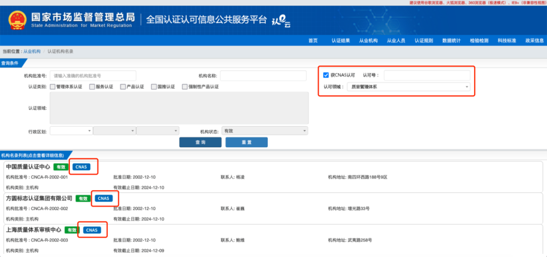 當用戶輸入/篩選機構(gòu)批準號、機構(gòu)名稱、認證類別、認證領(lǐng)域、機構(gòu)狀態(tài)、行政區(qū)劃條件,若查詢結(jié)果中的認證機構(gòu)獲得CNAS認可,查詢結(jié)果列表標記“CNAS”字樣。
