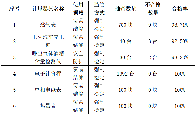 2022年,全市按照“雙隨機(jī)、一公開”監(jiān)管模式,對醫(yī)療衛(wèi)生、貿(mào)易結(jié)算、安全防護(hù)等領(lǐng)域使用的與人民群眾生活密切相關(guān)的計(jì)量器具進(jìn)行抽樣檢測,抽查民用三表、醫(yī)用儀器、X射線安全檢查儀、加油機(jī)、加氣機(jī)、電動汽車充電樁、氣體報(bào)警器、出租汽車計(jì)價(jià)器、固定式機(jī)動車?yán)走_(dá)測速儀、呼出氣體酒精含量檢測儀、電子計(jì)價(jià)秤、汽車衡等16類計(jì)量器具計(jì)量性能??傮w抽查情況為:抽查計(jì)量器具3557臺件,合格3467臺,不合格90臺,合格率97.46%,具體情況見下表: