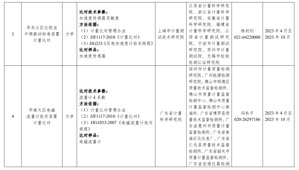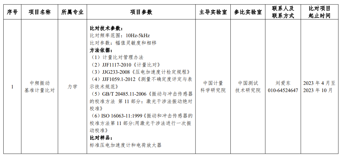 (一)國家計量基準(zhǔn)比對項目。根據(jù)國家計量基準(zhǔn)管理需求,結(jié)合具體工作實(shí)際,市場監(jiān)管總局決定組織中頻振動基準(zhǔn)計量比對等10項國家計量基準(zhǔn)比對項目(附件1)。