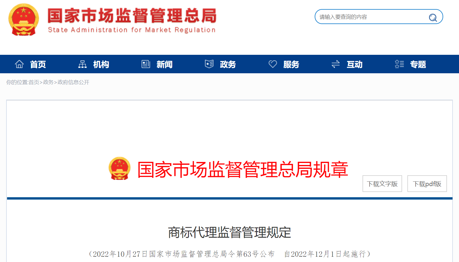 近日,國家市場監(jiān)管總局令第63號公布《商標(biāo)代理監(jiān)督管理規(guī)定》,該辦法自2022年12月1日起施行。 商標(biāo)代理監(jiān)督管理規(guī)定(2022年10月27日國家市場監(jiān)督管理總局令第63號公布