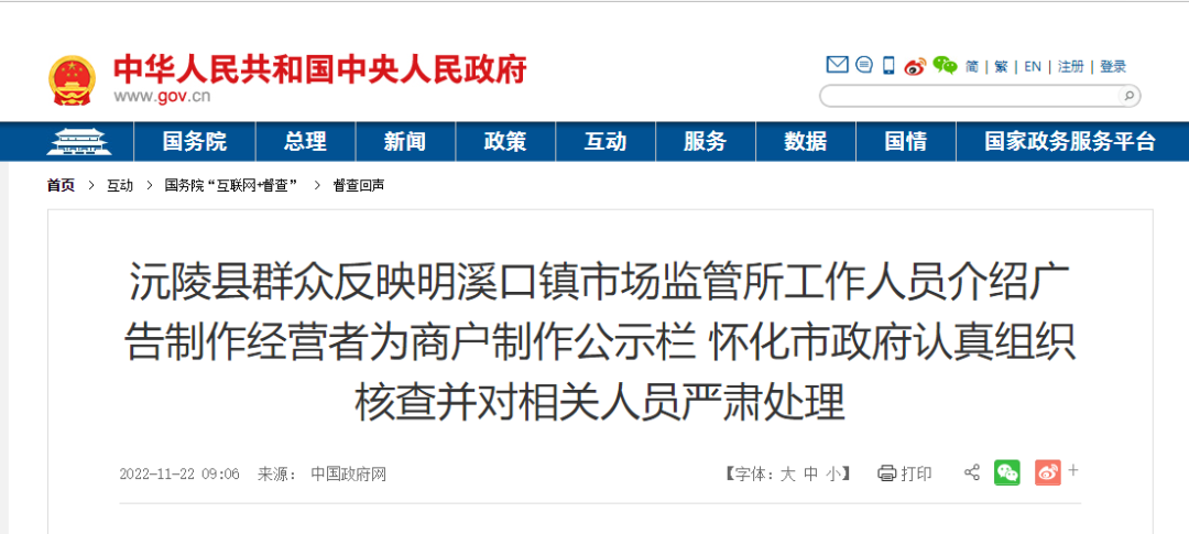 沅陵縣群眾反映明溪口鎮(zhèn)市場監(jiān)管所工作人員介紹廣告制作經(jīng)營者為商戶制作公示欄 懷化市政府認(rèn)真組織核查并對相關(guān)人員嚴(yán)肅處理2022-11-22 來源:中國政府網(wǎng) 沅陵縣劉先生通過
