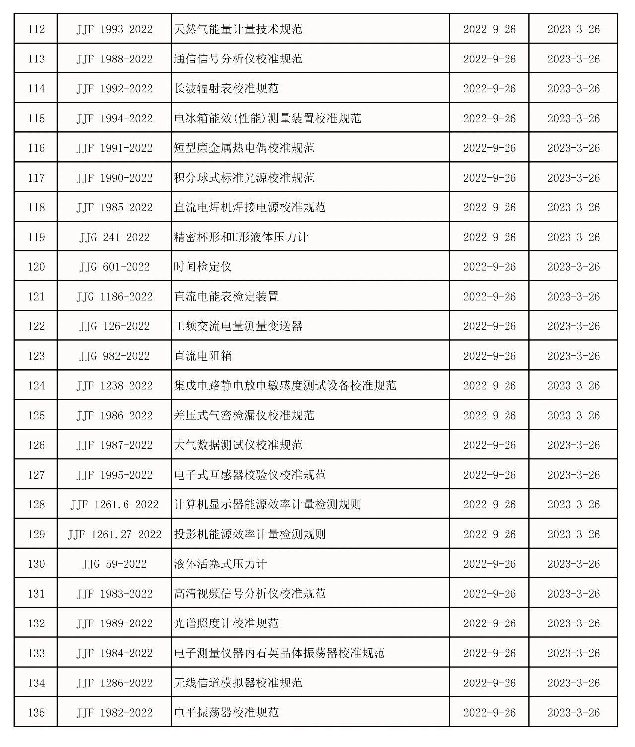 為方便量友了解最新計(jì)量技術(shù)規(guī)范實(shí)施信息,計(jì)量資訊速遞對(duì)2023年實(shí)施的135項(xiàng)國(guó)家計(jì)量技術(shù)規(guī)范進(jìn)行了匯總整理,供量友學(xué)習(xí)參考。詳細(xì)如下:2023年實(shí)施的國(guó)家計(jì)量技術(shù)規(guī)范匯總