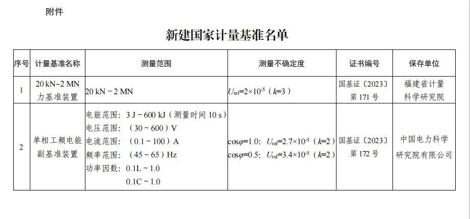 根據(jù)《中華人民共和國計量法》《中華人民共和國計量法實施細(xì)則》以及《計量基準(zhǔn)管理辦法》相關(guān)規(guī)定,批準(zhǔn)建立“20 kN~2 MN力基準(zhǔn)裝置”、“單相工頻電能副基