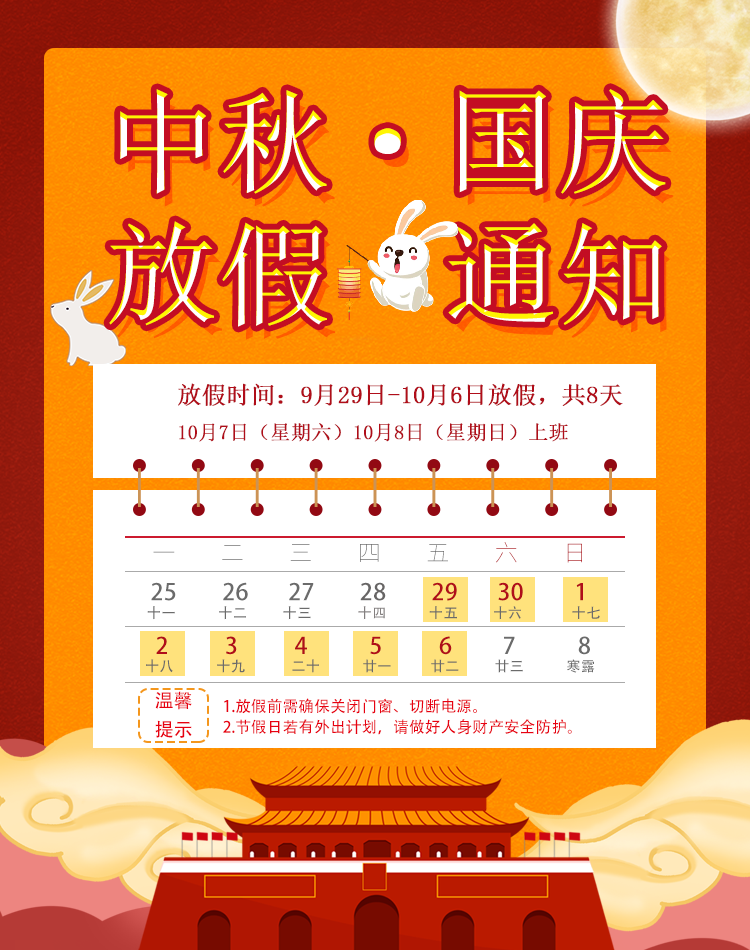 根據(jù)國家相關(guān)規(guī)定,結(jié)合我司情況,我司中秋國慶節(jié)放假安排如下: