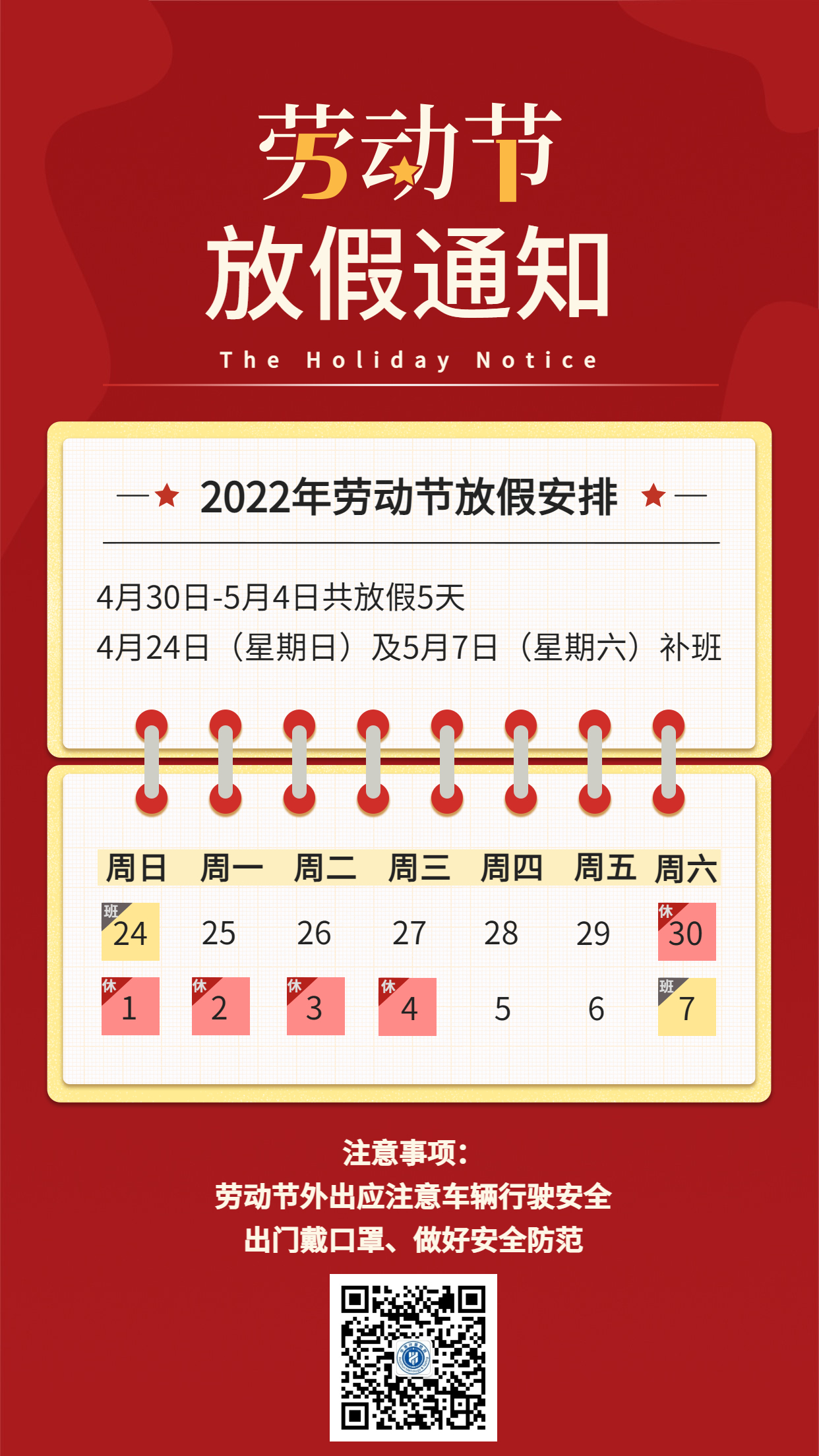 根據(jù)《國(guó)務(wù)院辦公廳關(guān)于2022年節(jié)假日安排的通知》,現(xiàn)將我司2022年“五一”勞動(dòng)節(jié)放假有關(guān)事項(xiàng)通知如下: